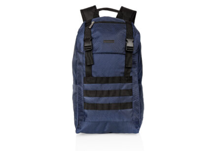 Morral para laptop con respaldo ergonómico. Cuenta con un bolsillo principal con cremallera y espuma en la parte trasera, así como un bolsillo frontal y dos bolsillos laterales con cremallera. También tiene dos bolsillos laterales de malla ideales para botellas o cables. Incluye una placa metálica para marca láser.