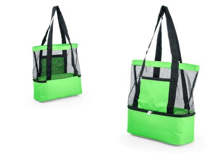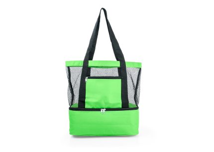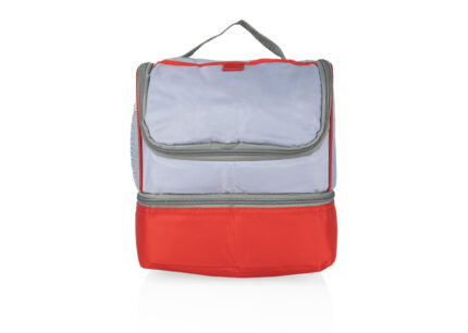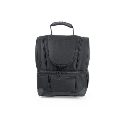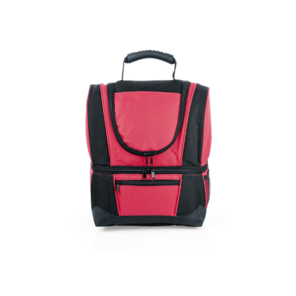 Lonchera de doble compartimiento con manija reforzada, recubrimiento interno y separador en malla de PVC, resistente a la humedad; al exterior bolsillo frontal con cremallera y bolsillo lateral libre en malla. El compartimiento posterior tiene capacidad para llevar hasta 12 latas de bebidas.