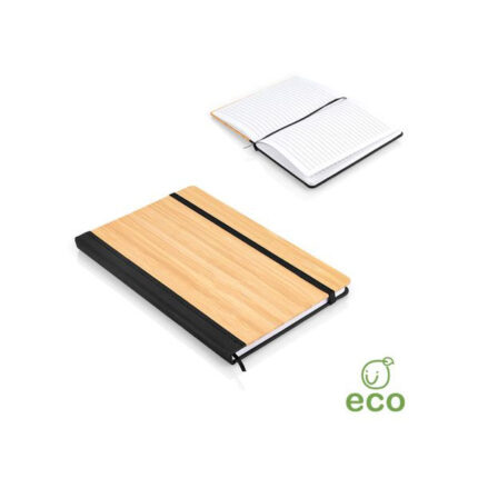 Libreta con cubierta en Bambú. Con banda elástica de cierre. Cinta marcadora. 80 hojas rayadas. Tamaño aproximado de la hoja: