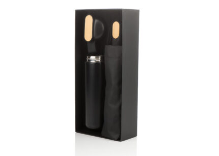 Set ejecutivo con estuche de lujo. Incluye botella de 600 ml / 20 Oz en acero inoxidable con tapa rosca y banda de silicona para transportar con facilidad, y paraguas mini de 19". Ambos elementos tienen un detalle en bambú para marcar con láser.