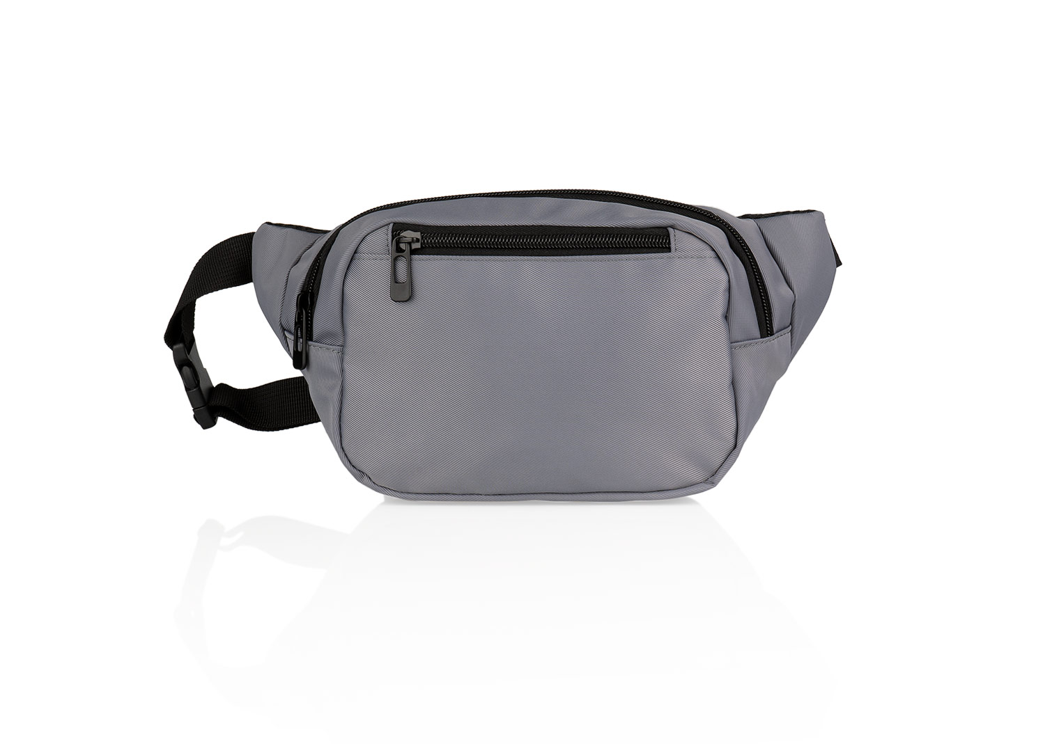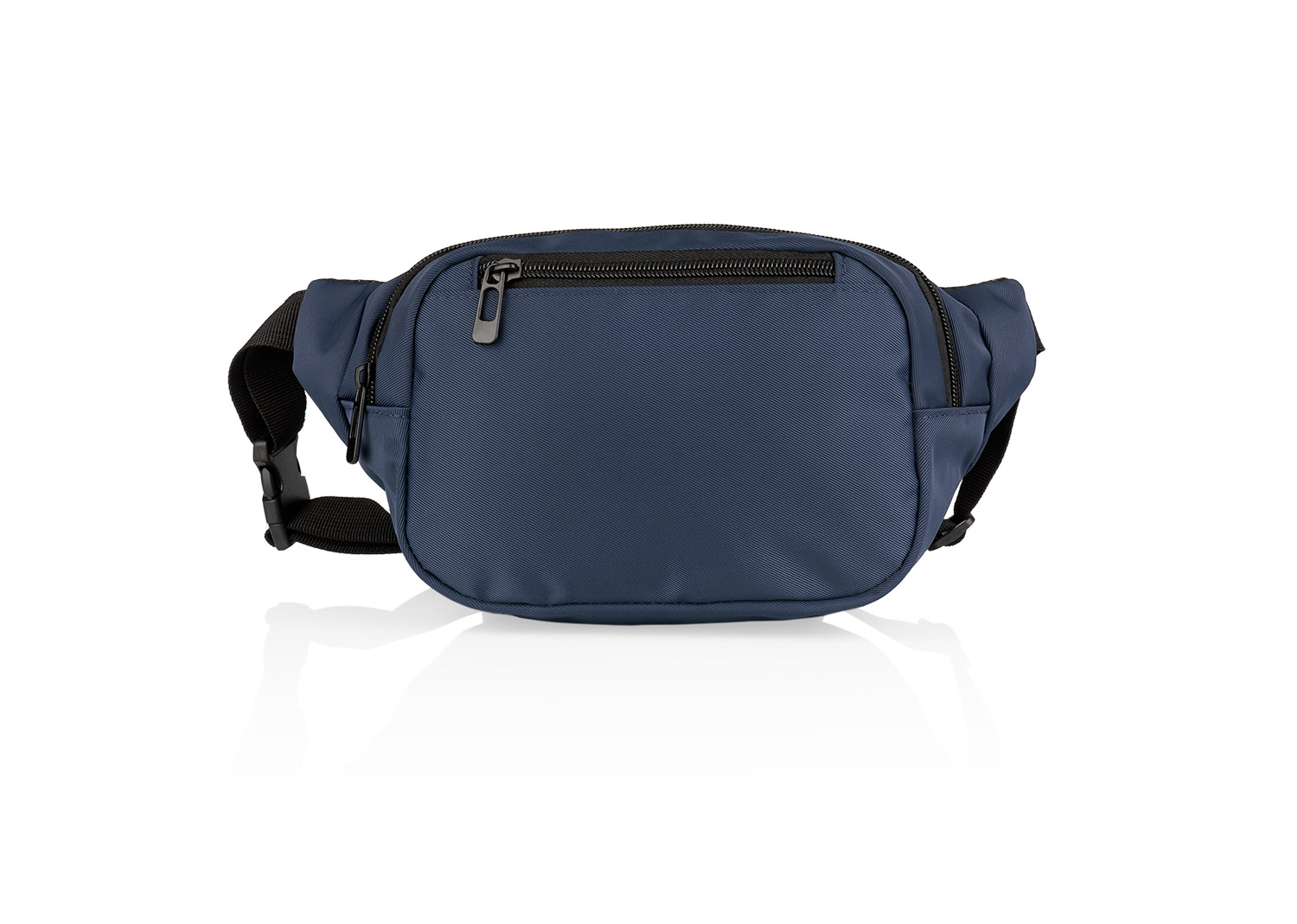 Canguro con bolsillo frontal y trasero con cremallera, y correa ajustable a la cintura con broche de hebilla.