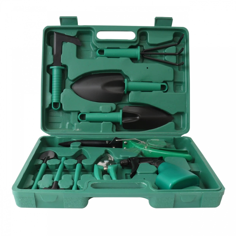 Juego de herramientas para jardín con mangos de polipropileno con 10 piezas y su respectivo estuche.