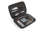 Set de herramientas en estuche metálico con cremallera. Incluye 10 puntas ajustables de diferentes formas, 5 copas, 2 destornilladores de precisión, pinza con cortafríos, 3 llaves allen y cinta métrica de 1 metro / 39 pulgadas.